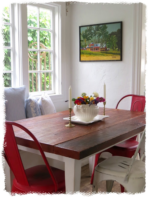 Your dining room looks fabulous. You know me; I am a minimalist! And the white walls with touches of red and that gorgeous table top....OH MY! That's all that's needed here.